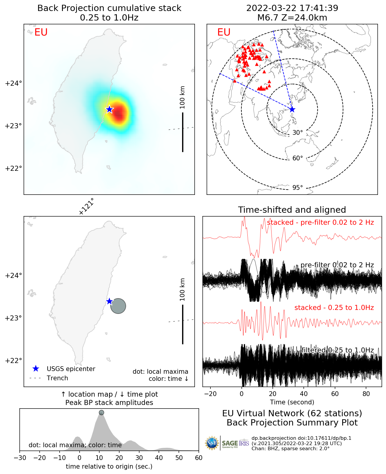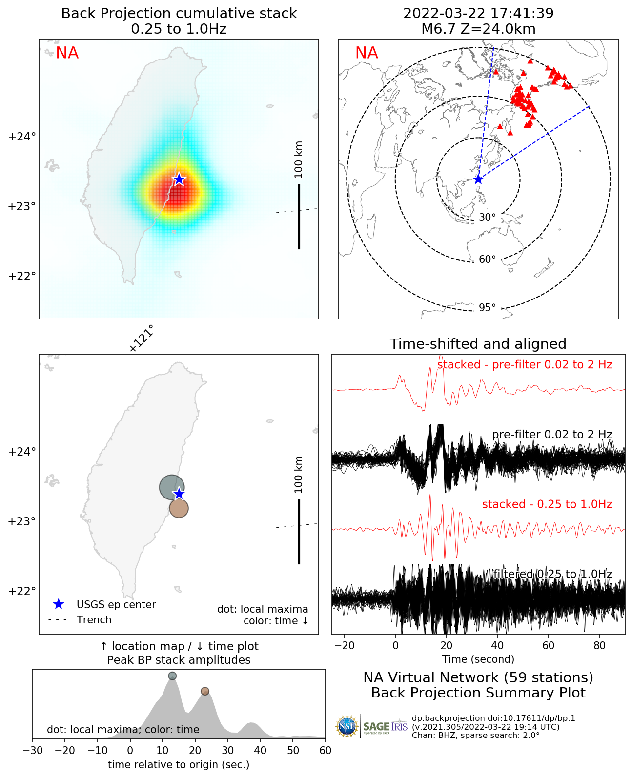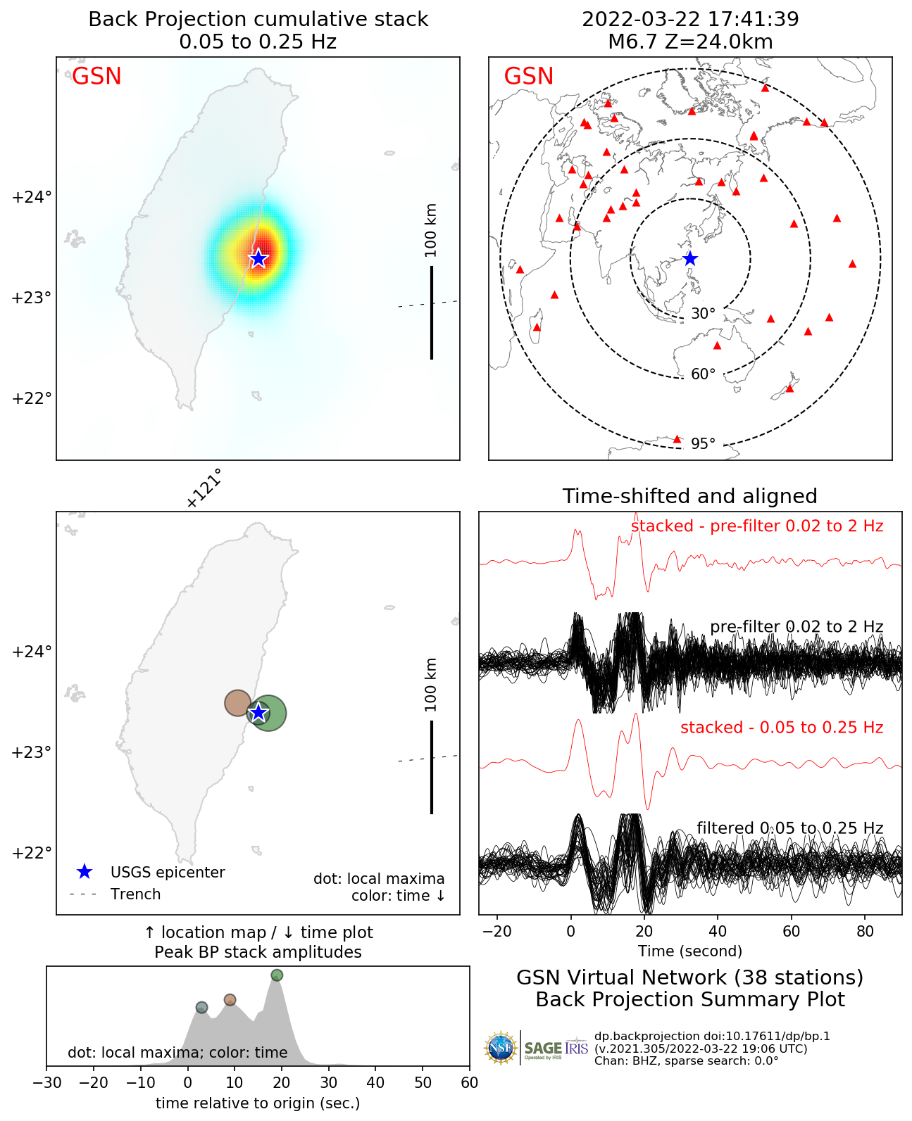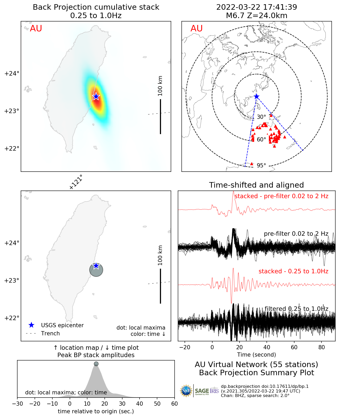 The Back Projection (BP) product shows the beamformed time history and location of coherent short period P-wave energy generated by large earthquakes observed at three regional arrays and across the Global Seismic Network. These are automatically generated following all global M6.5+ earthquakes. Virtual networks are formed by choosing stations within 25 degrees distance or azimuth to the center of three continents (NAmerica, EUrope, AUstralia). All available BHZ data are then aligned using a Multi-Channel Cross Correlation scheme which also downsamples the network by only choosing the stations with the highest average cross-correlation coefficient and at least one degree distance to it's nearest neighboring stations. BPs are performed by beam forming energy using square-root stacking to a flat grid around the source region with variable spatial resolution scaled by the magnitude of the earthquake. A 5 s wide cosine taper is used to average the beams. BP results are then averaged over time windows whose length increases with magnitude. The upper gallery shows a movie of the combined BPs from all networks with sufficient data. The array response function is also shown which is generated using the same processing techniques and stations, except the raw data are replaced with synthetic seismograms with 5 s wide point-source triangle functions. The first and last frames show cumulative time integrated results. Results are affected by radiation pattern, Greens functions variations and array geometry. Warmer colors indicate greater beam power. A small cross shows the location of the peak beam power when absolute beam powers are low. The lower gallery shows a summary figure for each array's BP as well as the individual array movie. In the summary figure, the lower left panel shows the time and location of local maxima. The colors correspond to relative time and the diameter to relative beam power. The other panels show the time-integrated results, the source-receiver geometry, and the MCCC aligned traces. At the bottom of the page, text files with peak beam power (and their Lat/Lon location) as a function of time relative to origin are given for both the data and the synthetic ARF. For more information on Back Projections visit the Backprojection product page. |