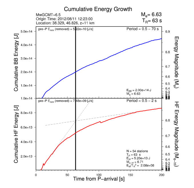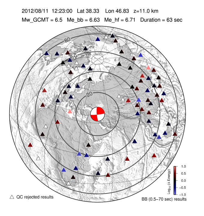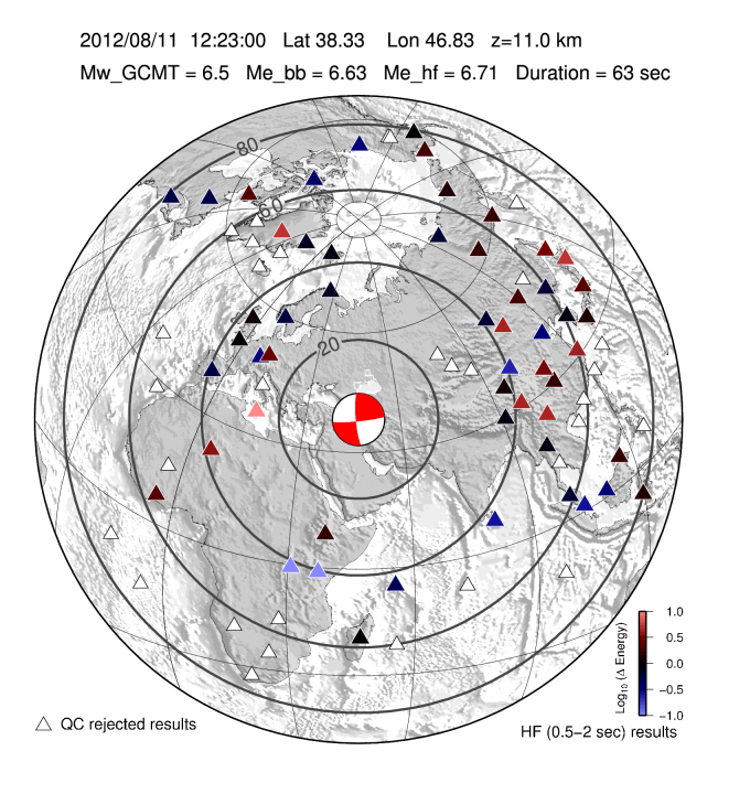 Earthquake energy and rupture duration are estimated by integrating P-wave energy from a global distribution of stations from 25-80 degrees distance following all Mw 6.0+ earthquakes with a GCMT moment tensor. The method follows Convers & Newman, 2011. For more information regarding EQ Energy products visit the IRIS EQ Energy Product Page. |