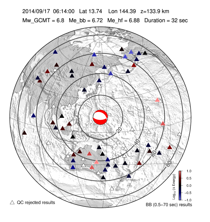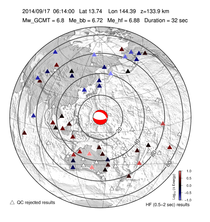 Earthquake energy and rupture duration are estimated by integrating P-wave energy from a global distribution of stations from 25-80 degrees distance following all Mw 6.0+ earthquakes with a GCMT moment tensor. The method follows Convers & Newman, 2011. For more information regarding EQ Energy products visit the IRIS EQ Energy Product Page. |