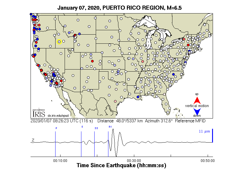The Ground Motion Visualization (GMV) illustrates how seismic waves travel away from the earthquake location by depicting the recorded wave amplitudes at each seismic station location using colored symbols. For more information on GMVs visit the GMV product page. Two types of GMVs are produced: