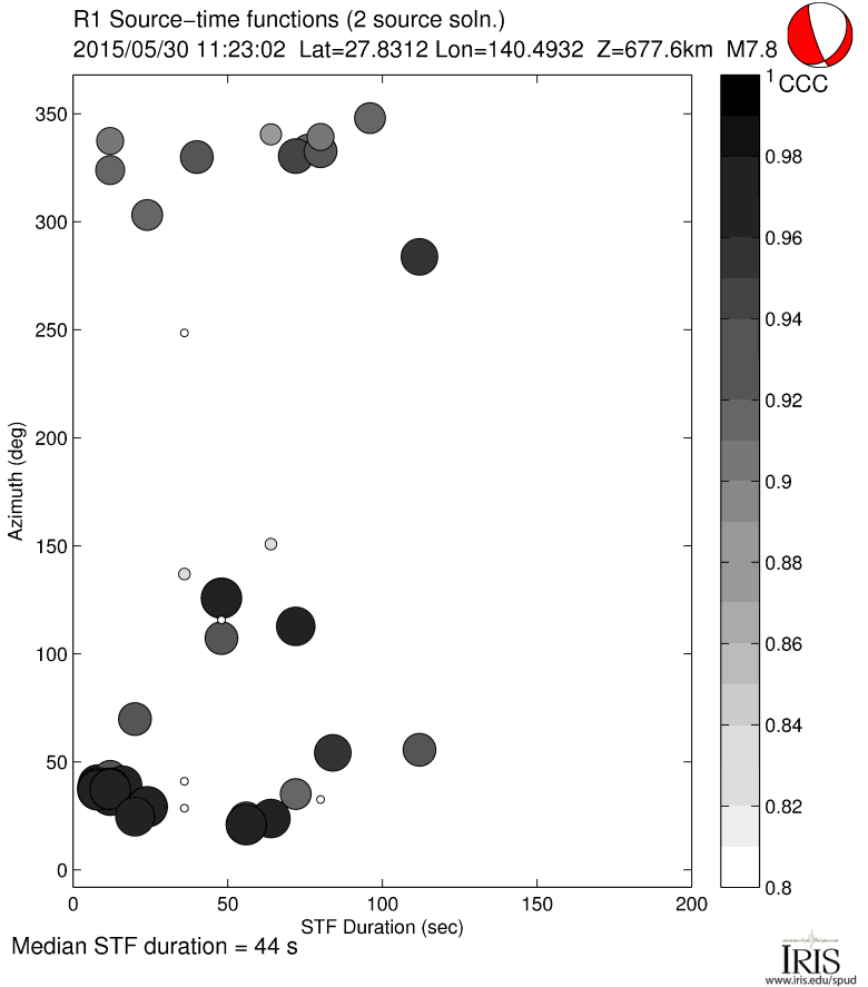 Point-source synthetic seismograms (theoretical Green's functions) are used along with vertical component (LHZ channel) recordings of short-arc Rayleigh waves (R1) from M7.0+ earthquakes to calculate source time functions at GSN and other stations. STFs are estimated using a simple two-source forward modeling approach by sweeping through the parameter space of two smoothed triangle and/or trapezoid functions of various widths, offset and amplitude and retaining the best fitting solution.