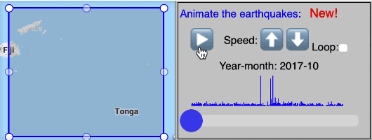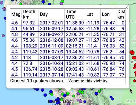 When zooming and panning, the earthquakes displayed update dynamically. The filter options mentioned above are re-applied and the database re-queried as soon as the mouse (or finger on a tablet) is released -- to match the currently-visible boundaries of the map. With larger numbers of events this can cause a delay which is not convenient.