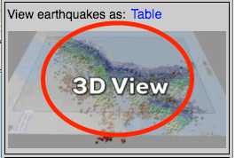 Earthquakes shown or selected on the map may be viewed in a table, rotated in 3D or downloaded using the "View earthquakes as: Table or 3D", found in the Options panel.