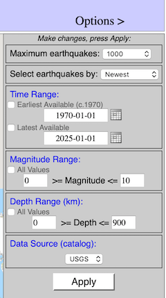 The first two options, Maximum earthquakes: and Select earthquakes by: , determine the number of earthquakes and which of the millions available will be displayed on the map. The rest of the options further restrict ranges of time, magnitude and depth to affect what is displayed. You will be prompted to press Apply when you make changes to these settings.