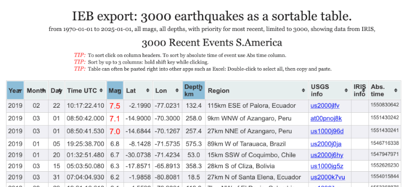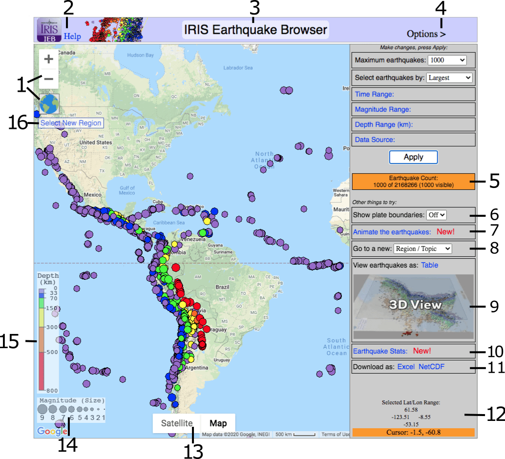 IEB is a Google map. By default, it uses earthquake data obtained about every 15 minutes from the USGS. IEB has accumulated about 3 million USGS earthquakes, dating from about 1970 to about an hour ago.