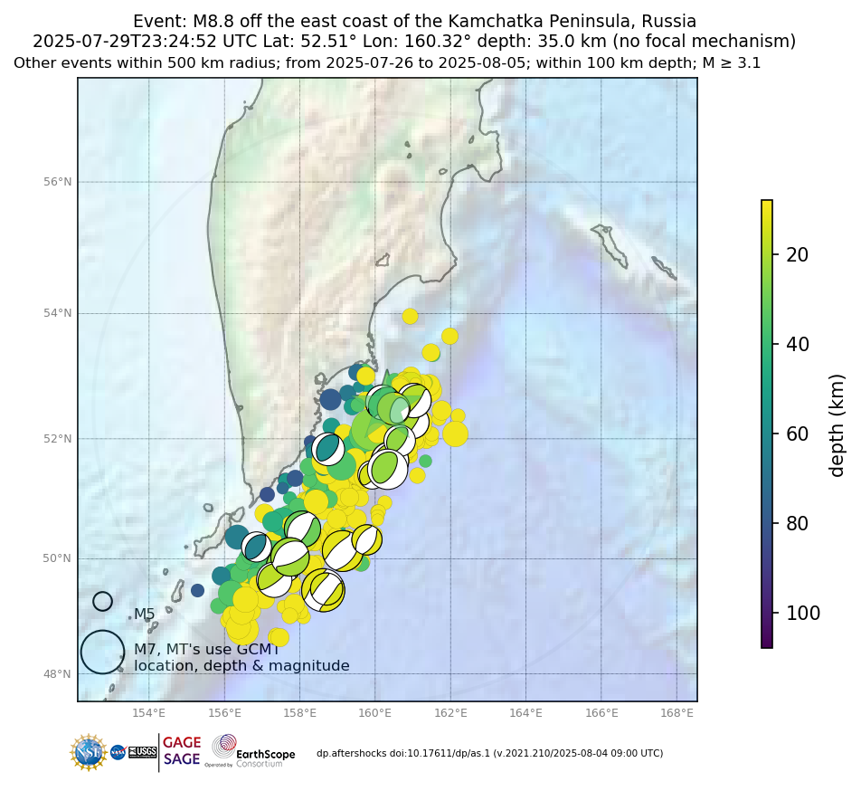 Aftershocks for Mww 8.8 OFF EAST COAST OF KAMCHATKA |