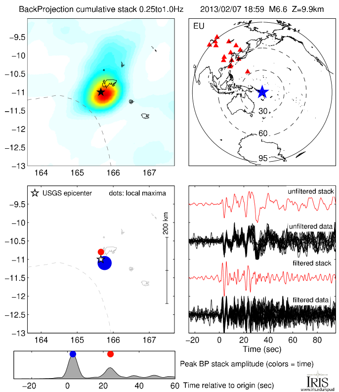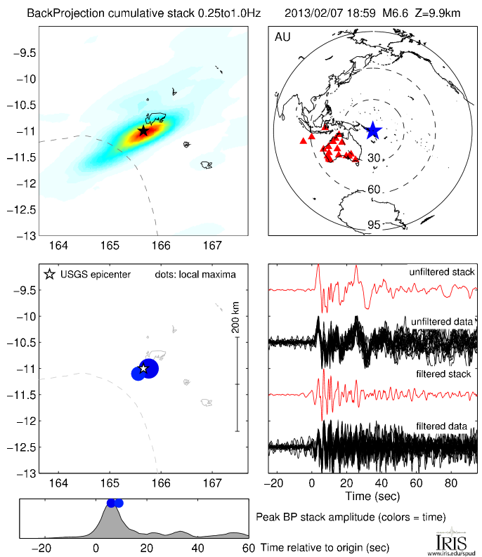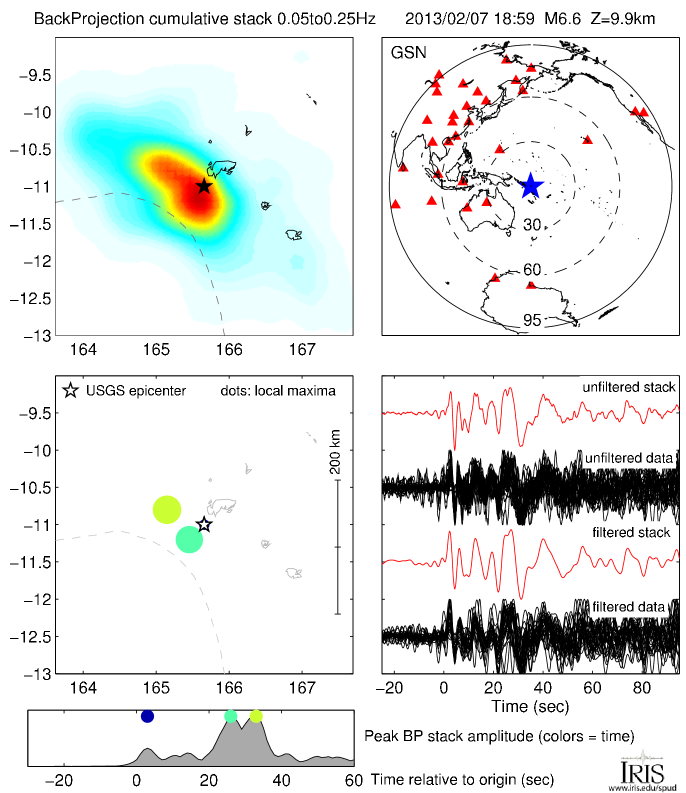 The Back Projection (BP) product shows the beamformed time history and location of coherent short period P-wave energy generated by large earthquakes observed at three regional arrays and across the Global Seismic Network. These are automatically generated following all global M6.5+ earthquakes. Virtual networks are formed by choosing stations within 25 degrees distance or azimuth to the center of three continents (NAmerica, EUrope, AUstralia). All available BHZ data are then aligned using a Multi-Channel Cross Correlation scheme which also downsamples the network by only choosing the stations with the highest average cross-correlation coefficient and at least one degree distance to it's nearest neighboring stations. BPs are performed by beam forming energy using square-root stacking to a flat grid around the source region with variable spatial resolution scaled by the magnitude of the earthquake. A 5 s wide cosine taper is used to average the beams. BP results are then averaged over time windows whose length increases with magnitude. The upper gallery shows a movie of the combined BPs from all networks with sufficient data. The array response function is also shown which is generated using the same processing techniques and stations, except the raw data are replaced with synthetic seismograms with 5 s wide point-source triangle functions. The first and last frames show cumulative time integrated results. Results are affected by radiation pattern, Greens functions variations and array geometry. Warmer colors indicate greater beam power. A small cross shows the location of the peak beam power when absolute beam powers are low. The lower gallery shows a summary figure for each array's BP as well as the individual array movie. In the summary figure, the lower left panel shows the time and location of local maxima. The colors correspond to relative time and the diameter to relative beam power. The other panels show the time-integrated results, the source-receiver geometry, and the MCCC aligned traces. At the bottom of the page, text files with peak beam power (and their Lat/Lon location) as a function of time relative to origin are given for both the data and the synthetic ARF. For more information on Back Projections visit the Backprojection product page. |