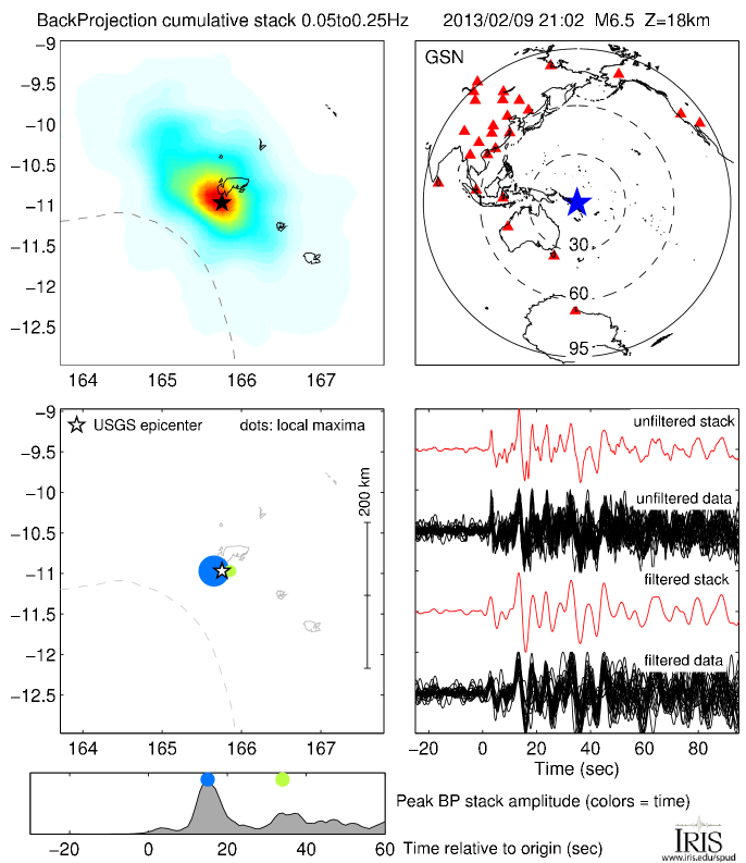 The Back Projection (BP) product shows the beamformed time history and location of coherent short period P-wave energy generated by large earthquakes observed at three regional arrays and across the Global Seismic Network. These are automatically generated following all global M6.5+ earthquakes. Virtual networks are formed by choosing stations within 25 degrees distance or azimuth to the center of three continents (NAmerica, EUrope, AUstralia). All available BHZ data are then aligned using a Multi-Channel Cross Correlation scheme which also downsamples the network by only choosing the stations with the highest average cross-correlation coefficient and at least one degree distance to it's nearest neighboring stations. BPs are performed by beam forming energy using square-root stacking to a flat grid around the source region with variable spatial resolution scaled by the magnitude of the earthquake. A 5 s wide cosine taper is used to average the beams. BP results are then averaged over time windows whose length increases with magnitude. The upper gallery shows a movie of the combined BPs from all networks with sufficient data. The array response function is also shown which is generated using the same processing techniques and stations, except the raw data are replaced with synthetic seismograms with 5 s wide point-source triangle functions. The first and last frames show cumulative time integrated results. Results are affected by radiation pattern, Greens functions variations and array geometry. Warmer colors indicate greater beam power. A small cross shows the location of the peak beam power when absolute beam powers are low. The lower gallery shows a summary figure for each array's BP as well as the individual array movie. In the summary figure, the lower left panel shows the time and location of local maxima. The colors correspond to relative time and the diameter to relative beam power. The other panels show the time-integrated results, the source-receiver geometry, and the MCCC aligned traces. At the bottom of the page, text files with peak beam power (and their Lat/Lon location) as a function of time relative to origin are given for both the data and the synthetic ARF. For more information on Back Projections visit the Backprojection product page. |