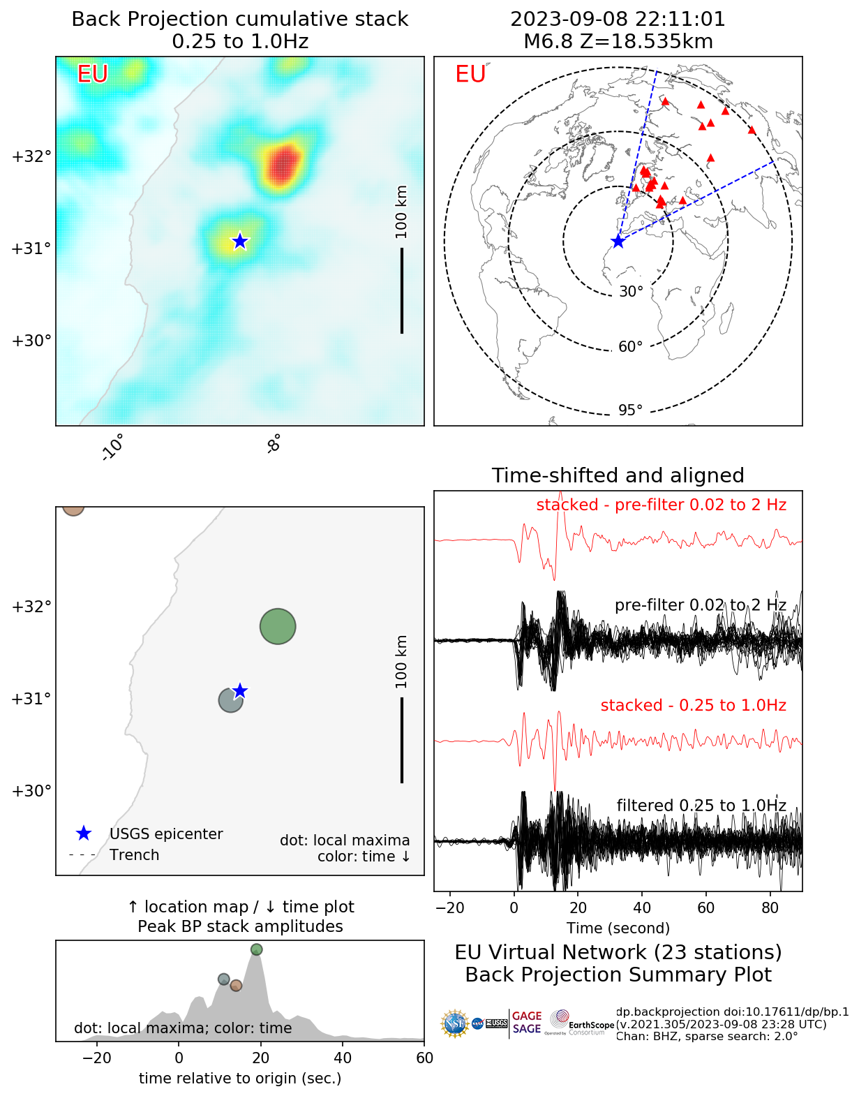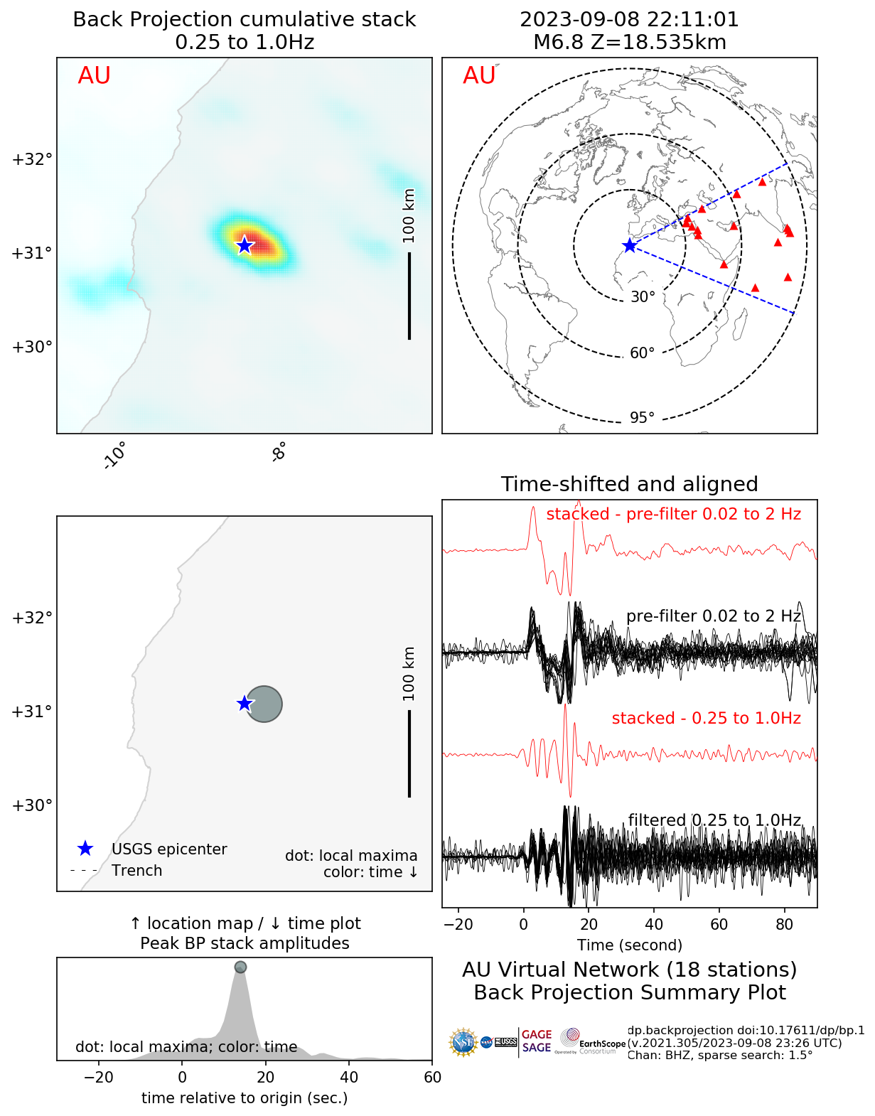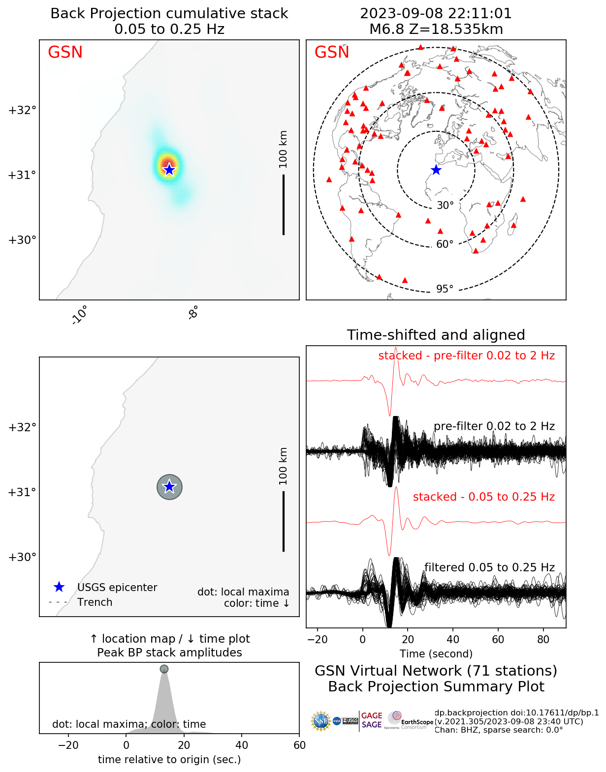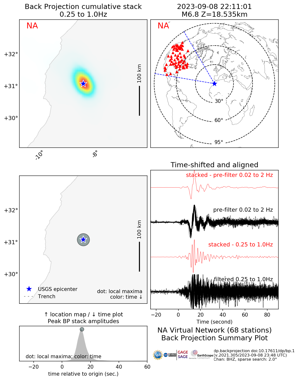 The Back Projection (BP) product shows the beamformed time history and location of coherent short period P-wave energy generated by large earthquakes observed at three regional arrays and across the Global Seismic Network. These are automatically generated following all global M6.5+ earthquakes. Virtual networks are formed by choosing stations within 25 degrees distance or azimuth to the center of three continents (NAmerica, EUrope, AUstralia). All available BHZ data are then aligned using a Multi-Channel Cross Correlation scheme which also downsamples the network by only choosing the stations with the highest average cross-correlation coefficient and at least one degree distance to it's nearest neighboring stations. BPs are performed by beam forming energy using square-root stacking to a flat grid around the source region with variable spatial resolution scaled by the magnitude of the earthquake. A 5 s wide cosine taper is used to average the beams. BP results are then averaged over time windows whose length increases with magnitude. The upper gallery shows a movie of the combined BPs from all networks with sufficient data. The array response function is also shown which is generated using the same processing techniques and stations, except the raw data are replaced with synthetic seismograms with 5 s wide point-source triangle functions. The first and last frames show cumulative time integrated results. Results are affected by radiation pattern, Greens functions variations and array geometry. Warmer colors indicate greater beam power. A small cross shows the location of the peak beam power when absolute beam powers are low. The lower gallery shows a summary figure for each array's BP as well as the individual array movie. In the summary figure, the lower left panel shows the time and location of local maxima. The colors correspond to relative time and the diameter to relative beam power. The other panels show the time-integrated results, the source-receiver geometry, and the MCCC aligned traces. At the bottom of the page, text files with peak beam power (and their Lat/Lon location) as a function of time relative to origin are given for both the data and the synthetic ARF. For more information on Back Projections visit the Backprojection product page. |