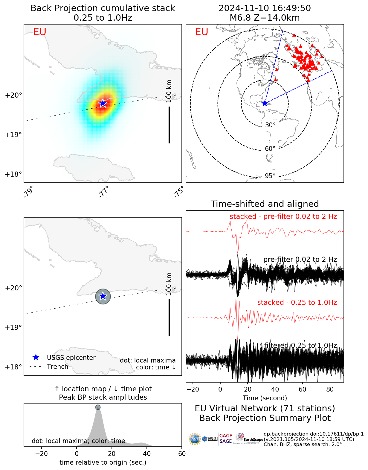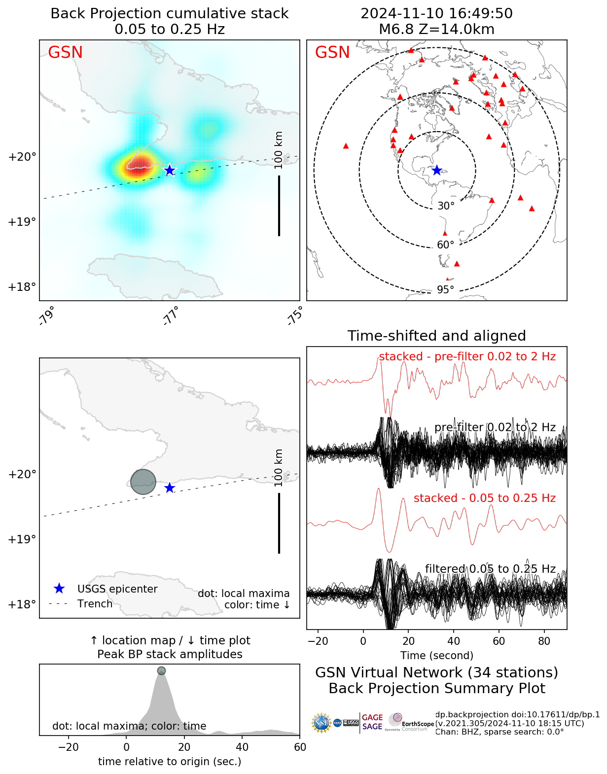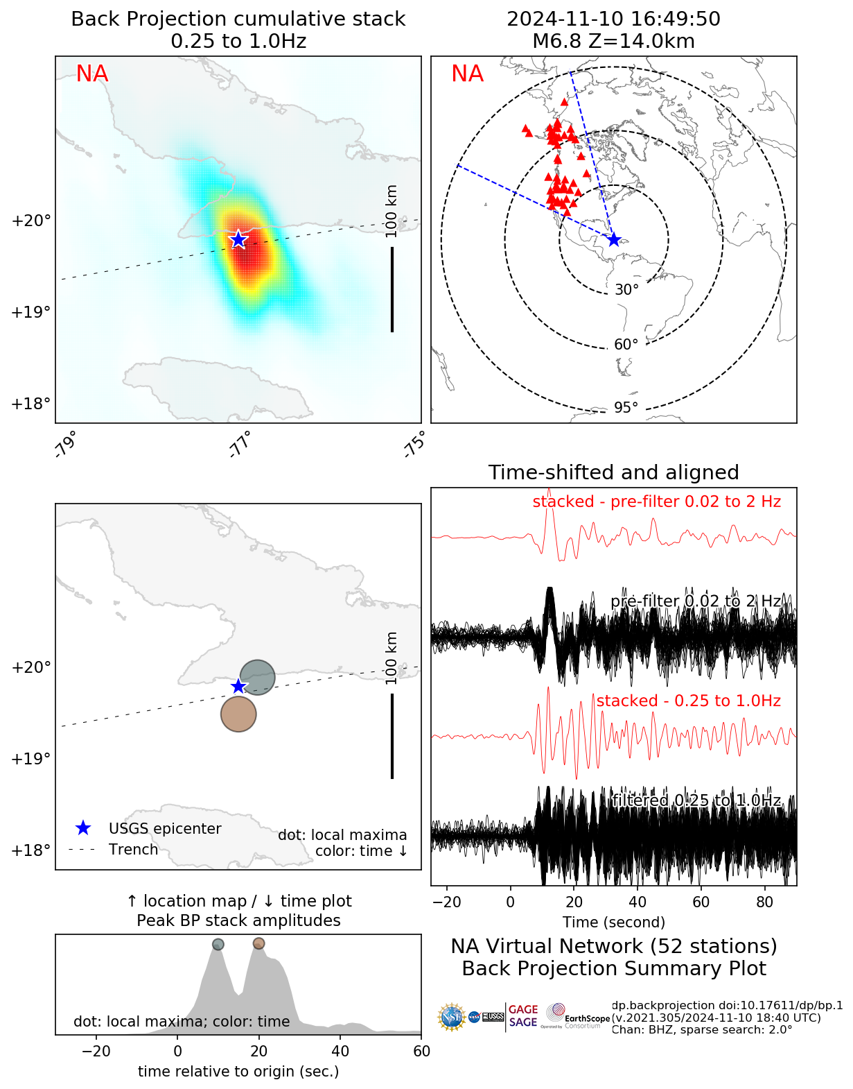 The Back Projection (BP) product shows the beamformed time history and location of coherent short period P-wave energy generated by large earthquakes observed at three regional arrays and across the Global Seismic Network. These are automatically generated following all global M6.5+ earthquakes. Virtual networks are formed by choosing stations within 25 degrees distance or azimuth to the center of three continents (NAmerica, EUrope, AUstralia). All available BHZ data are then aligned using a Multi-Channel Cross Correlation scheme which also downsamples the network by only choosing the stations with the highest average cross-correlation coefficient and at least one degree distance to it's nearest neighboring stations. BPs are performed by beam forming energy using square-root stacking to a flat grid around the source region with variable spatial resolution scaled by the magnitude of the earthquake. A 5 s wide cosine taper is used to average the beams. BP results are then averaged over time windows whose length increases with magnitude. The upper gallery shows a movie of the combined BPs from all networks with sufficient data. The array response function is also shown which is generated using the same processing techniques and stations, except the raw data are replaced with synthetic seismograms with 5 s wide point-source triangle functions. The first and last frames show cumulative time integrated results. Results are affected by radiation pattern, Greens functions variations and array geometry. Warmer colors indicate greater beam power. A small cross shows the location of the peak beam power when absolute beam powers are low. The lower gallery shows a summary figure for each array's BP as well as the individual array movie. In the summary figure, the lower left panel shows the time and location of local maxima. The colors correspond to relative time and the diameter to relative beam power. The other panels show the time-integrated results, the source-receiver geometry, and the MCCC aligned traces. At the bottom of the page, text files with peak beam power (and their Lat/Lon location) as a function of time relative to origin are given for both the data and the synthetic ARF. For more information on Back Projections visit the Backprojection product page. |