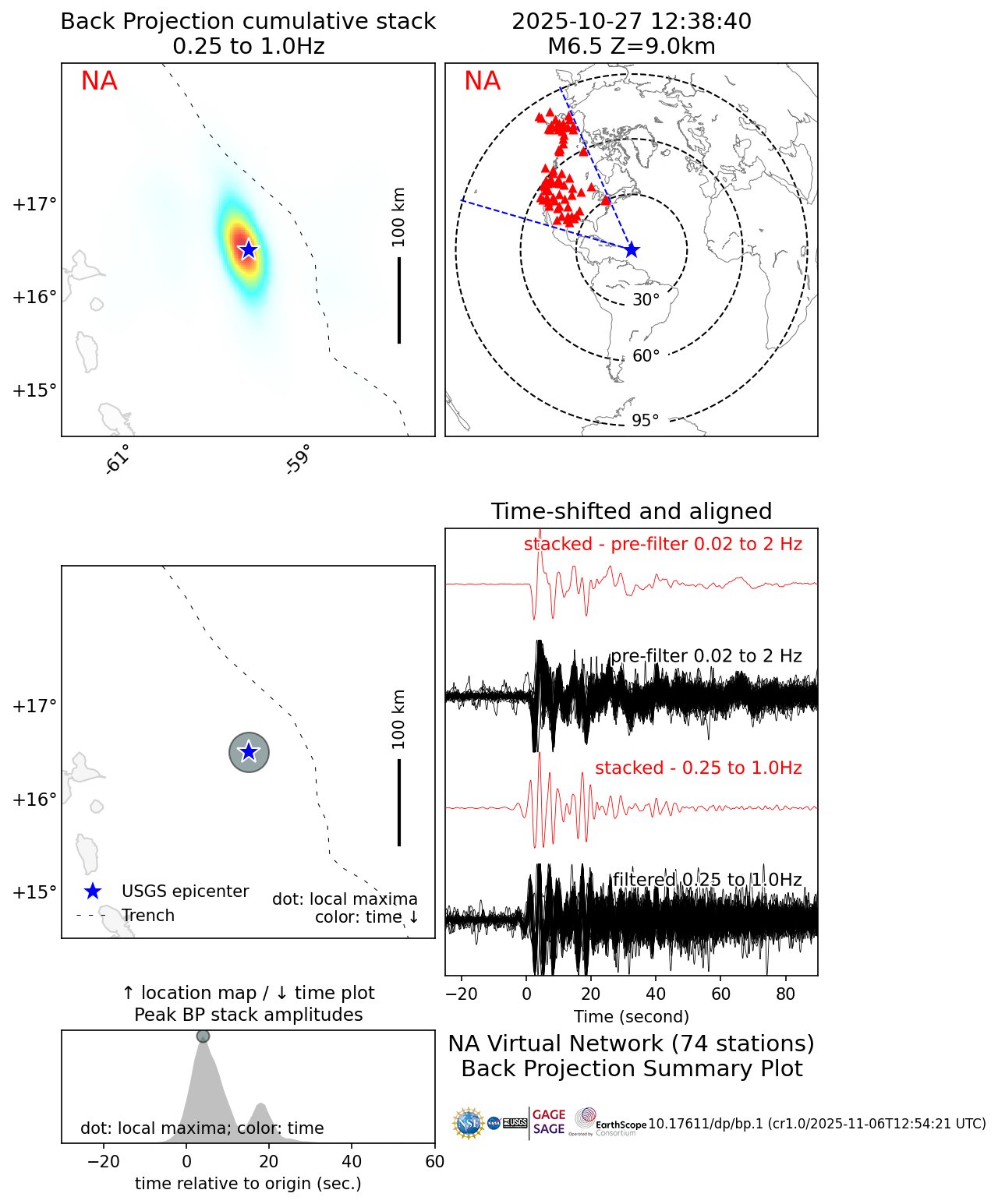 The Back Projection (BP) product shows the beamformed time history and location of coherent short period P-wave energy generated by large earthquakes observed at three regional arrays and across the Global Seismic Network. These are automatically generated following all global M6.5+ earthquakes. Virtual networks are formed by choosing stations within 25 degrees distance or azimuth to the center of three continents (NAmerica, EUrope, AUstralia). All available BHZ data are then aligned using a Multi-Channel Cross Correlation scheme which also downsamples the network by only choosing the stations with the highest average cross-correlation coefficient and at least one degree distance to it's nearest neighboring stations. BPs are performed by beam forming energy using square-root stacking to a flat grid around the source region with variable spatial resolution scaled by the magnitude of the earthquake. A 5 s wide cosine taper is used to average the beams. BP results are then averaged over time windows whose length increases with magnitude. The upper gallery shows a movie of the combined BPs from all networks with sufficient data. The array response function is also shown which is generated using the same processing techniques and stations, except the raw data are replaced with synthetic seismograms with 5 s wide point-source triangle functions. The first and last frames show cumulative time integrated results. Results are affected by radiation pattern, Greens functions variations and array geometry. Warmer colors indicate greater beam power. A small cross shows the location of the peak beam power when absolute beam powers are low. The lower gallery shows a summary figure for each array's BP as well as the individual array movie. In the summary figure, the lower left panel shows the time and location of local maxima. The colors correspond to relative time and the diameter to relative beam power. The other panels show the time-integrated results, the source-receiver geometry, and the MCCC aligned traces. At the bottom of the page, text files with peak beam power (and their Lat/Lon location) as a function of time relative to origin are given for both the data and the synthetic ARF. For more information on Back Projections visit the Backprojection product page. |