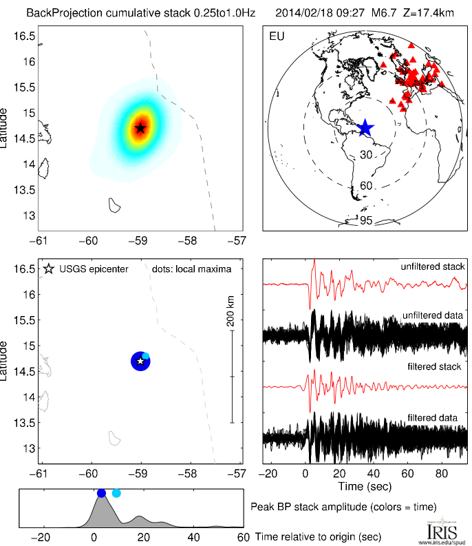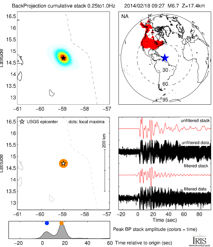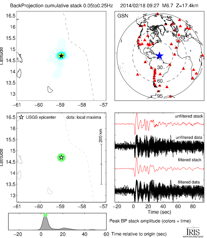 The Back Projection (BP) product shows the beamformed time history and location of coherent short period P-wave energy generated by large earthquakes observed at three regional arrays and across the Global Seismic Network. These are automatically generated following all global M6.5+ earthquakes. Virtual networks are formed by choosing stations within 25 degrees distance or azimuth to the center of three continents (NAmerica, EUrope, AUstralia). All available BHZ data are then aligned using a Multi-Channel Cross Correlation scheme which also downsamples the network by only choosing the stations with the highest average cross-correlation coefficient and at least one degree distance to it's nearest neighboring stations. BPs are performed by beam forming energy using square-root stacking to a flat grid around the source region with variable spatial resolution scaled by the magnitude of the earthquake. A 5 s wide cosine taper is used to average the beams. BP results are then averaged over time windows whose length increases with magnitude. The upper gallery shows a movie of the combined BPs from all networks with sufficient data. The array response function is also shown which is generated using the same processing techniques and stations, except the raw data are replaced with synthetic seismograms with 5 s wide point-source triangle functions. The first and last frames show cumulative time integrated results. Results are affected by radiation pattern, Greens functions variations and array geometry. Warmer colors indicate greater beam power. A small cross shows the location of the peak beam power when absolute beam powers are low. The lower gallery shows a summary figure for each array's BP as well as the individual array movie. In the summary figure, the lower left panel shows the time and location of local maxima. The colors correspond to relative time and the diameter to relative beam power. The other panels show the time-integrated results, the source-receiver geometry, and the MCCC aligned traces. At the bottom of the page, text files with peak beam power (and their Lat/Lon location) as a function of time relative to origin are given for both the data and the synthetic ARF. For more information on Back Projections visit the Backprojection product page. |