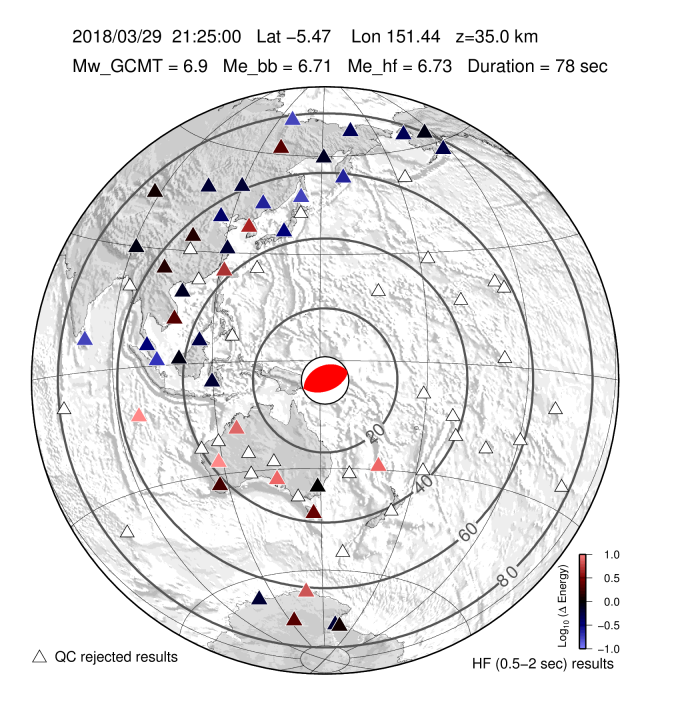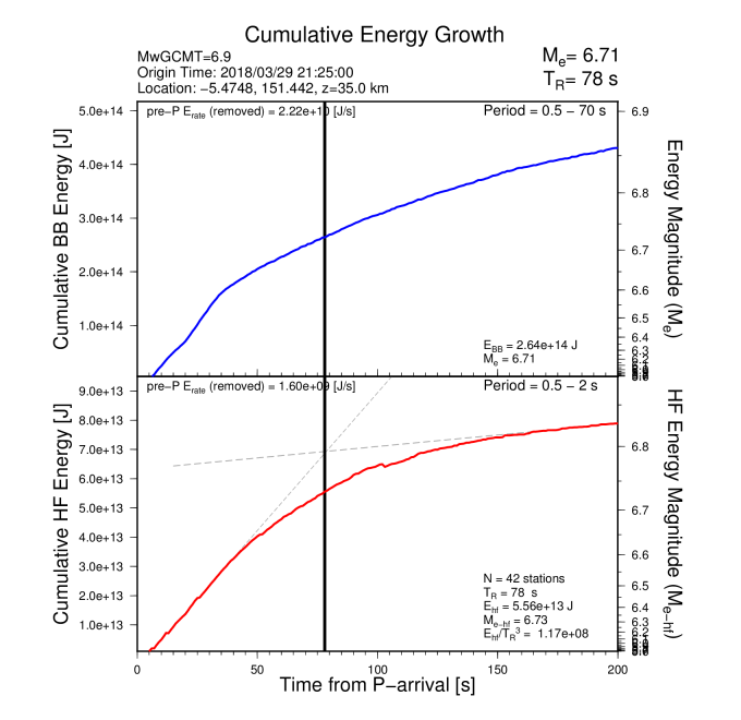 Earthquake energy and rupture duration are estimated by integrating P-wave energy from a global distribution of stations from 25-80 degrees distance following all Mw 6.0+ earthquakes with a GCMT moment tensor. The method follows Convers & Newman, 2011. For more information regarding EQ Energy products visit the IRIS EQ Energy Product Page. |