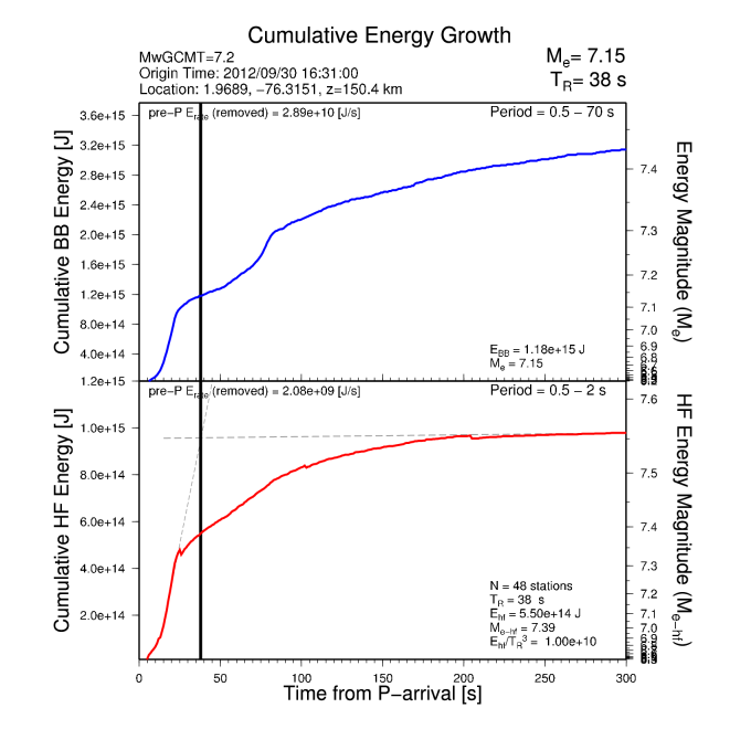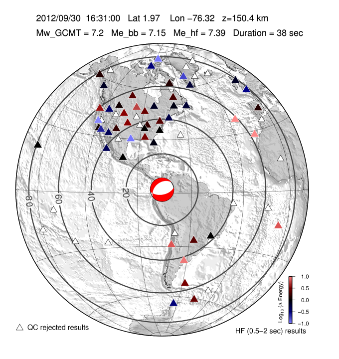 Earthquake energy and rupture duration are estimated by integrating P-wave energy from a global distribution of stations from 25-80 degrees distance following all Mw 6.0+ earthquakes with a GCMT moment tensor. The method follows Convers & Newman, 2011. For more information regarding EQ Energy products visit the IRIS EQ Energy Product Page. |
