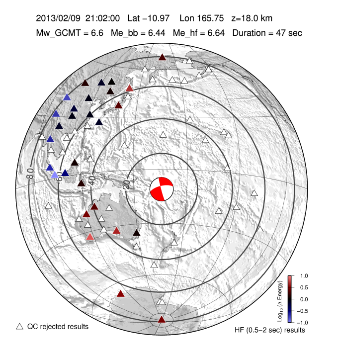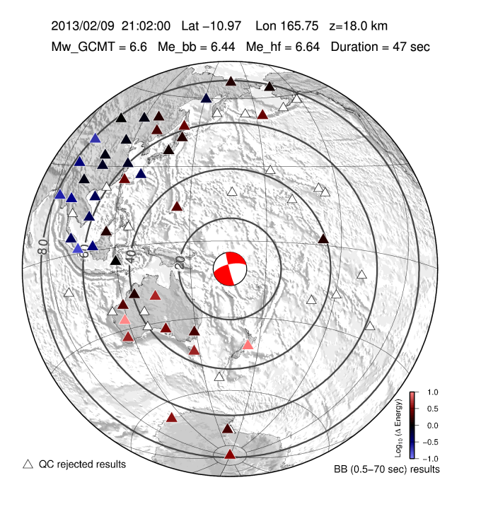 Earthquake energy and rupture duration are estimated by integrating P-wave energy from a global distribution of stations from 25-80 degrees distance following all Mw 6.0+ earthquakes with a GCMT moment tensor. The method follows Convers & Newman, 2011. For more information regarding EQ Energy products visit the IRIS EQ Energy Product Page. |