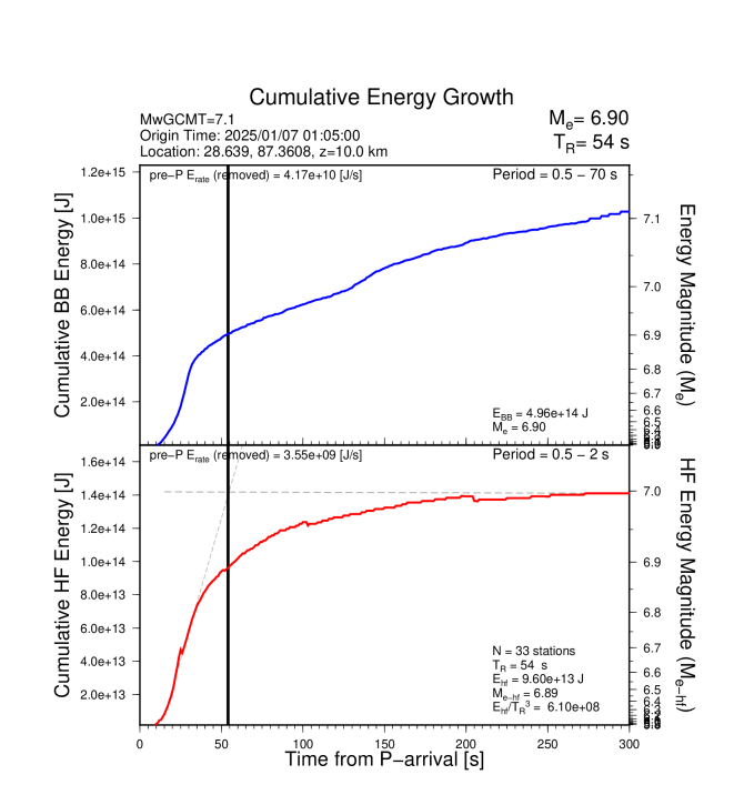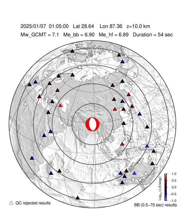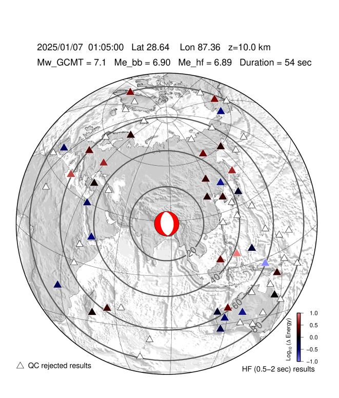 Earthquake energy and rupture duration are estimated by integrating P-wave energy from a global distribution of stations from 25-80 degrees distance following all Mw 6.0+ earthquakes with a GCMT moment tensor. The method follows Convers & Newman, 2011. For more information regarding EQ Energy products visit the IRIS EQ Energy Product Page. |