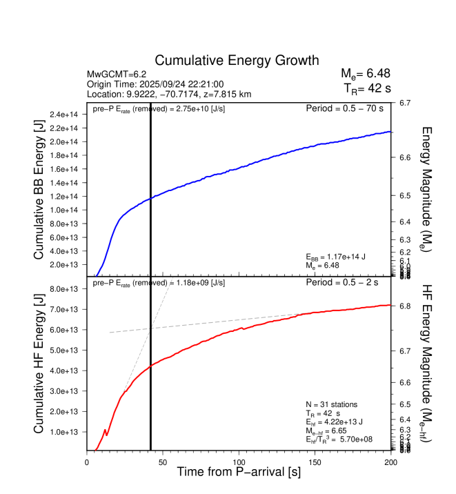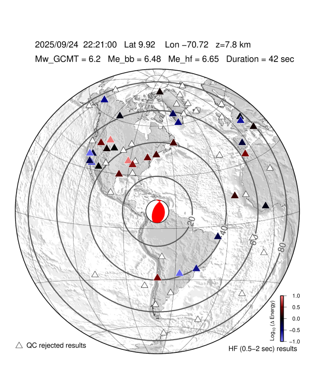 Earthquake energy and rupture duration are estimated by integrating P-wave energy from a global distribution of stations from 25-80 degrees distance following all Mw 6.0+ earthquakes with a GCMT moment tensor. The method follows Convers & Newman, 2011. For more information regarding EQ Energy products visit the IRIS EQ Energy Product Page. |