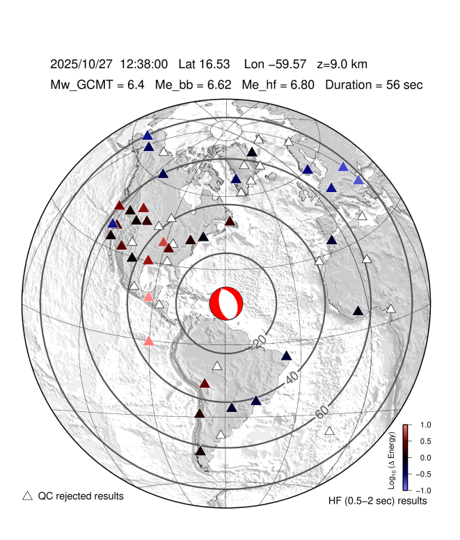 Earthquake energy and rupture duration are estimated by integrating P-wave energy from a global distribution of stations from 25-80 degrees distance following all Mw 6.0+ earthquakes with a GCMT moment tensor. The method follows Convers & Newman, 2011. For more information regarding EQ Energy products visit the IRIS EQ Energy Product Page. |