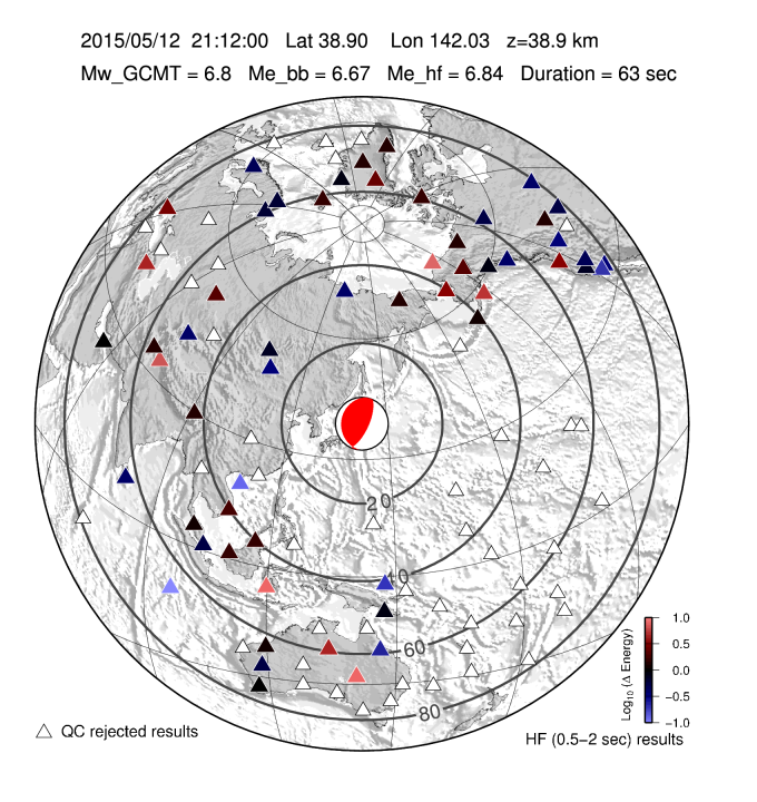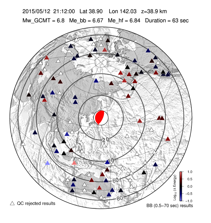 Earthquake energy and rupture duration are estimated by integrating P-wave energy from a global distribution of stations from 25-80 degrees distance following all Mw 6.0+ earthquakes with a GCMT moment tensor. The method follows Convers & Newman, 2011. For more information regarding EQ Energy products visit the IRIS EQ Energy Product Page. |
