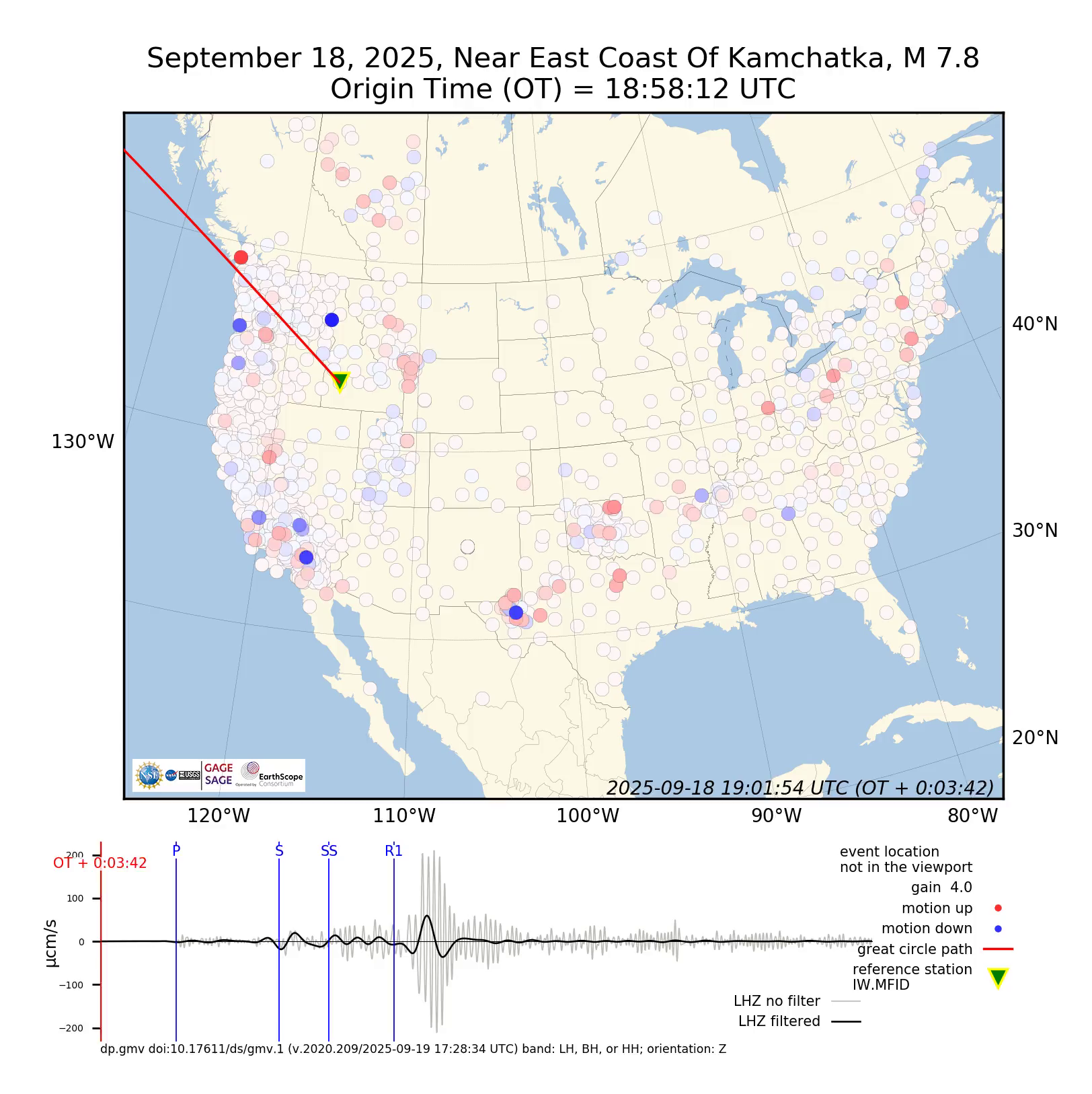 The Ground Motion Visualization (GMV) illustrates how seismic waves travel away from the earthquake location by depicting the recorded wave amplitudes at each seismic station location using colored symbols. For more information on GMVs visit the GMV product page. Two types of GMVs are produced: