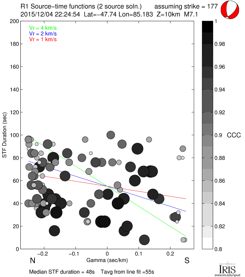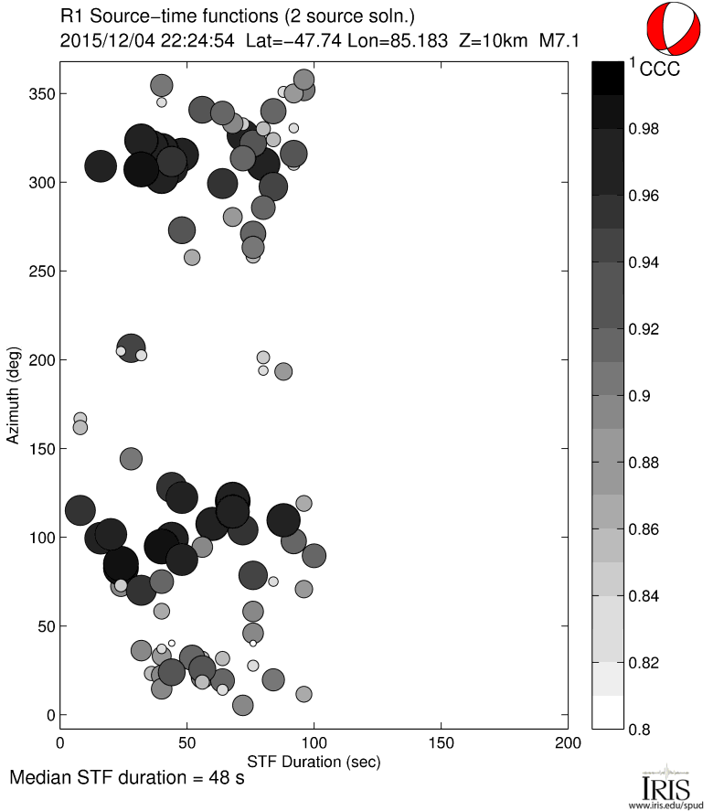 Point-source synthetic seismograms (theoretical Green's functions) are used along with vertical component (LHZ channel) recordings of short-arc Rayleigh waves (R1) from M7.0+ earthquakes to calculate source time functions at GSN and other stations. STFs are estimated using a simple two-source forward modeling approach by sweeping through the parameter space of two smoothed triangle and/or trapezoid functions of various widths, offset and amplitude and retaining the best fitting solution.