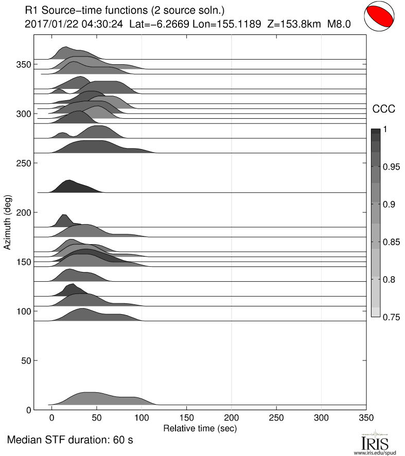 If you use Source Time Functions in publications, please cite according to the instructions at:http://ds.iris.edu/ds/products/sourcetimefunction/#citation Acknowledgements:Charles Ammon generously provided the time-domain iterative deconvolution portion of the code used. Luis Rivera generously provided the normal mode synthetic seismogram codes used. Results can be very sensitive to pre-processing, which neither C.A. nor L.R. contributed to.  |