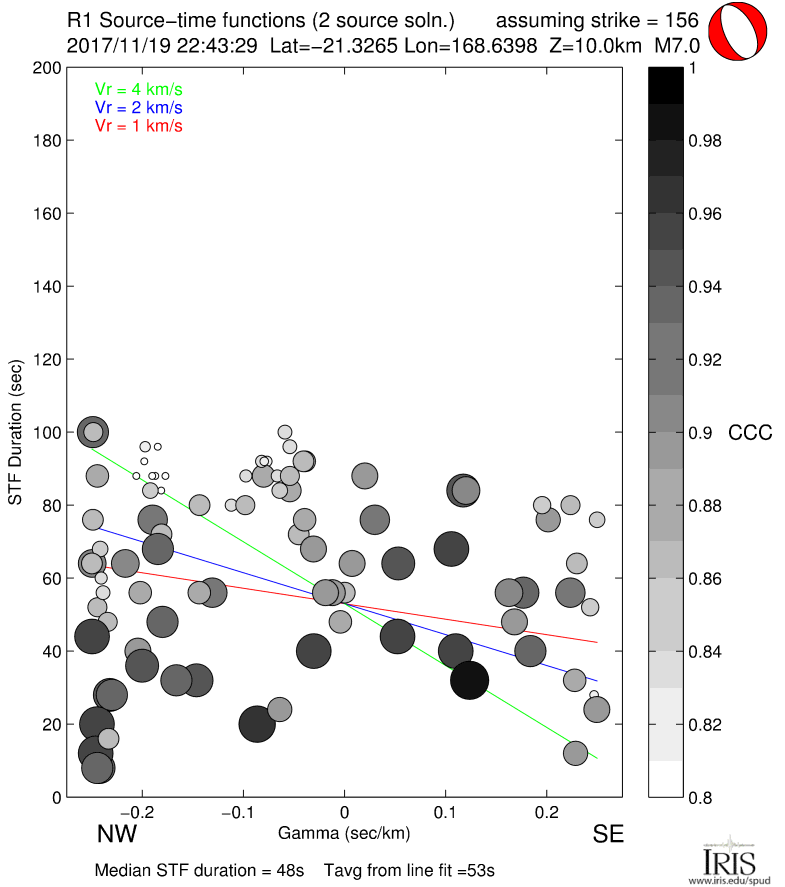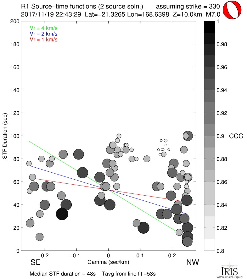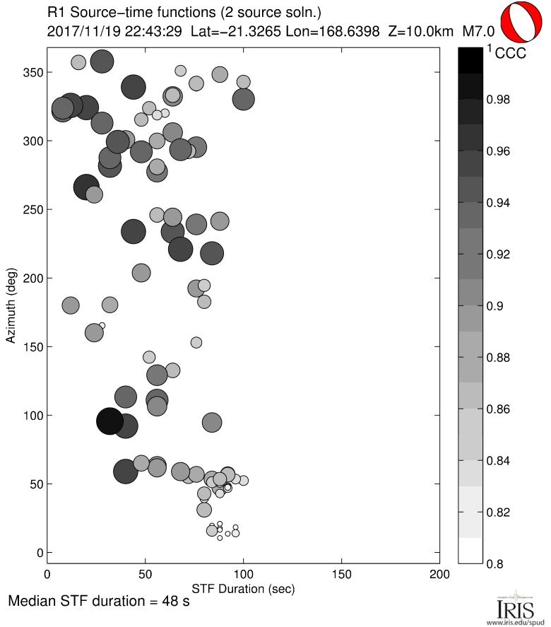 Point-source synthetic seismograms (theoretical Green's functions) are used along with vertical component (LHZ channel) recordings of short-arc Rayleigh waves (R1) from M7.0+ earthquakes to calculate source time functions at GSN and other stations. STFs are estimated using a simple two-source forward modeling approach by sweeping through the parameter space of two smoothed triangle and/or trapezoid functions of various widths, offset and amplitude and retaining the best fitting solution.
