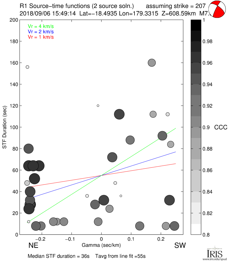 Point-source synthetic seismograms (theoretical Green's functions) are used along with vertical component (LHZ channel) recordings of short-arc Rayleigh waves (R1) from M7.0+ earthquakes to calculate source time functions at GSN and other stations. STFs are estimated using a simple two-source forward modeling approach by sweeping through the parameter space of two smoothed triangle and/or trapezoid functions of various widths, offset and amplitude and retaining the best fitting solution.