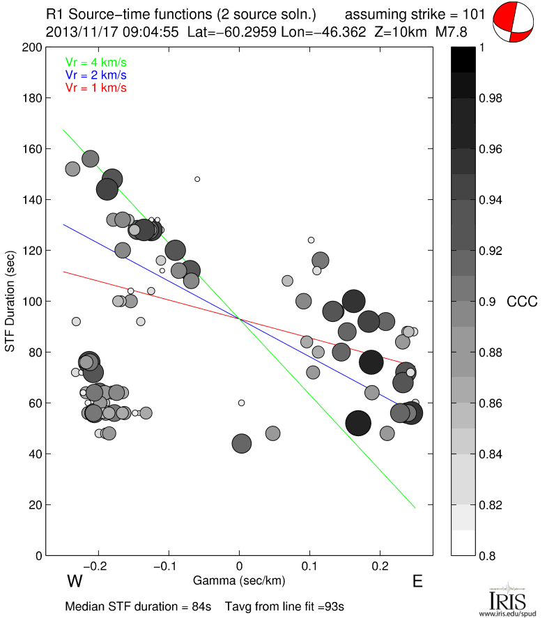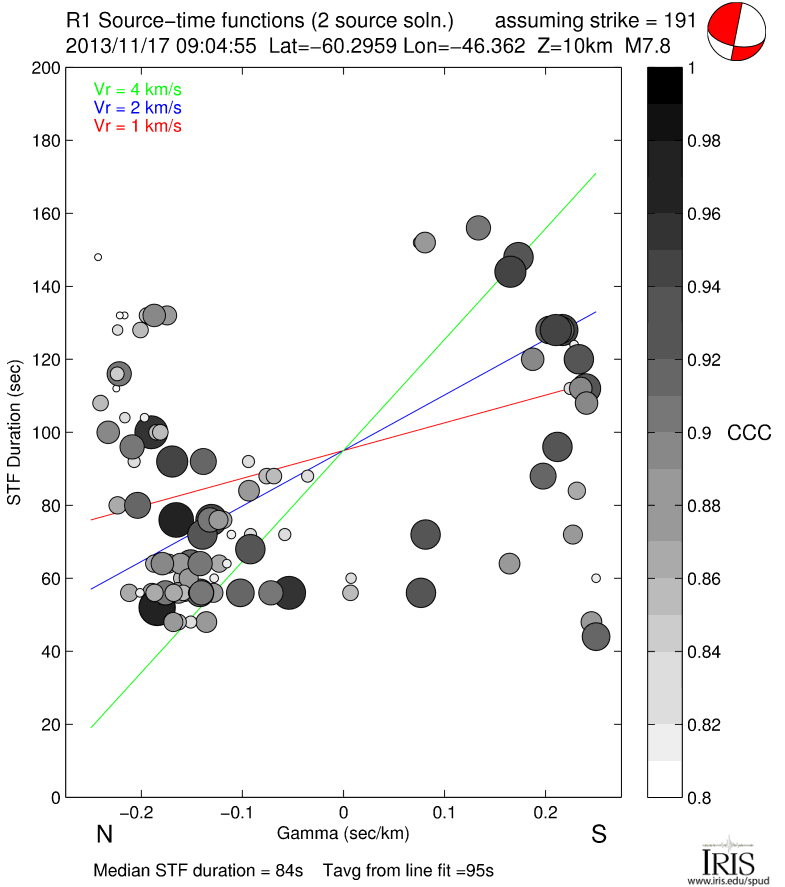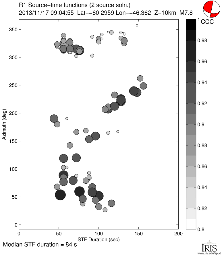 Point-source synthetic seismograms (theoretical Green's functions) are used along with vertical component (LHZ channel) recordings of short-arc Rayleigh waves (R1) from M7.0+ earthquakes to calculate source time functions at GSN and other stations. STFs are estimated using a simple two-source forward modeling approach by sweeping through the parameter space of two smoothed triangle and/or trapezoid functions of various widths, offset and amplitude and retaining the best fitting solution.