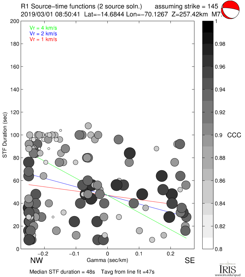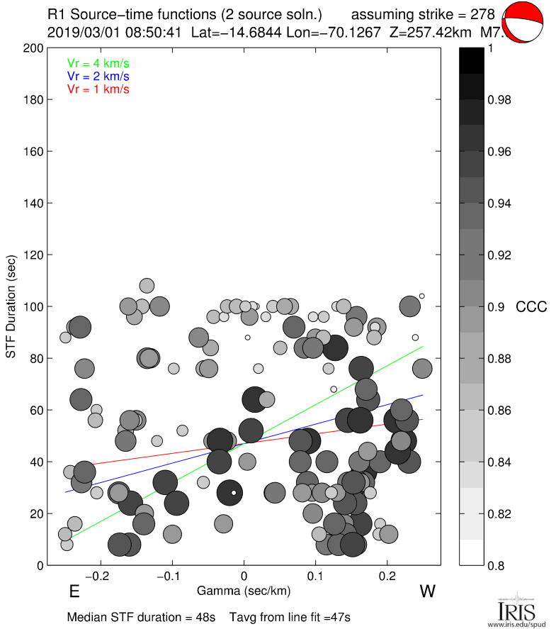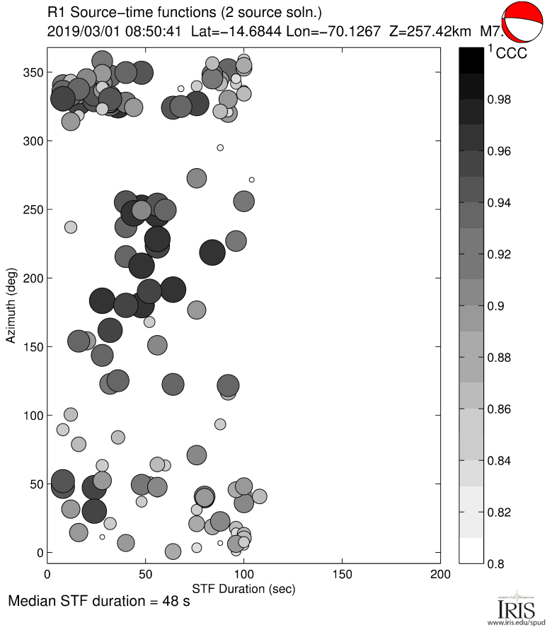 Point-source synthetic seismograms (theoretical Green's functions) are used along with vertical component (LHZ channel) recordings of short-arc Rayleigh waves (R1) from M7.0+ earthquakes to calculate source time functions at GSN and other stations. STFs are estimated using a simple two-source forward modeling approach by sweeping through the parameter space of two smoothed triangle and/or trapezoid functions of various widths, offset and amplitude and retaining the best fitting solution.