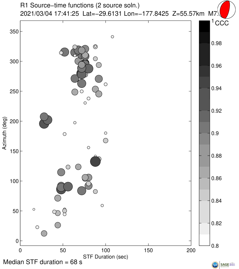 Point-source synthetic seismograms (theoretical Green's functions) are used along with vertical component (LHZ channel) recordings of short-arc Rayleigh waves (R1) from M7.0+ earthquakes to calculate source time functions at GSN and other stations. STFs are estimated using a simple two-source forward modeling approach by sweeping through the parameter space of two smoothed triangle and/or trapezoid functions of various widths, offset and amplitude and retaining the best fitting solution.