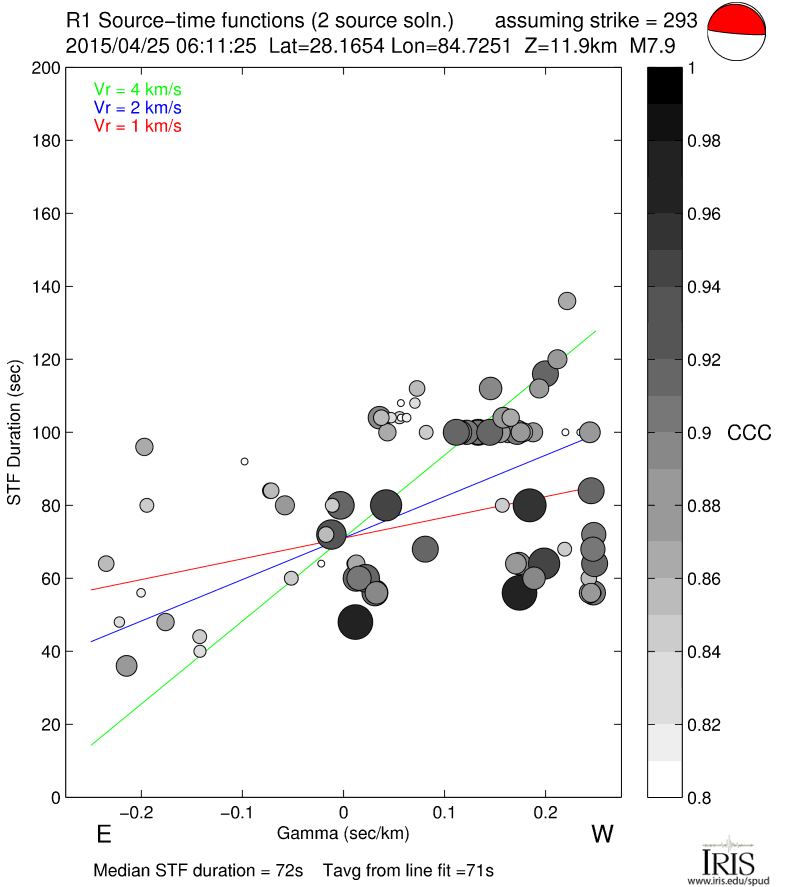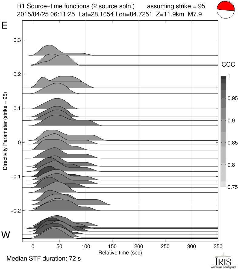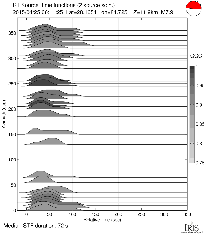 Point-source synthetic seismograms (theoretical Green's functions) are used along with vertical component (LHZ channel) recordings of short-arc Rayleigh waves (R1) from M7.0+ earthquakes to calculate source time functions at GSN and other stations. STFs are estimated using a simple two-source forward modeling approach by sweeping through the parameter space of two smoothed triangle and/or trapezoid functions of various widths, offset and amplitude and retaining the best fitting solution.