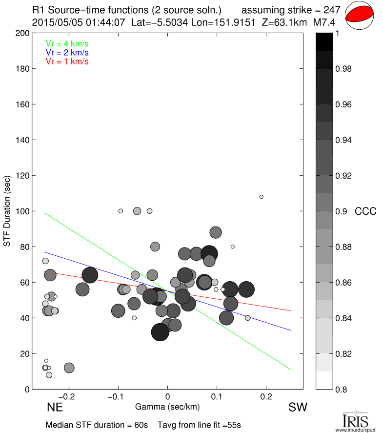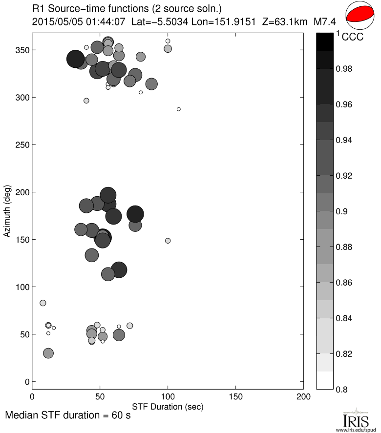 Point-source synthetic seismograms (theoretical Green's functions) are used along with vertical component (LHZ channel) recordings of short-arc Rayleigh waves (R1) from M7.0+ earthquakes to calculate source time functions at GSN and other stations. STFs are estimated using a simple two-source forward modeling approach by sweeping through the parameter space of two smoothed triangle and/or trapezoid functions of various widths, offset and amplitude and retaining the best fitting solution.