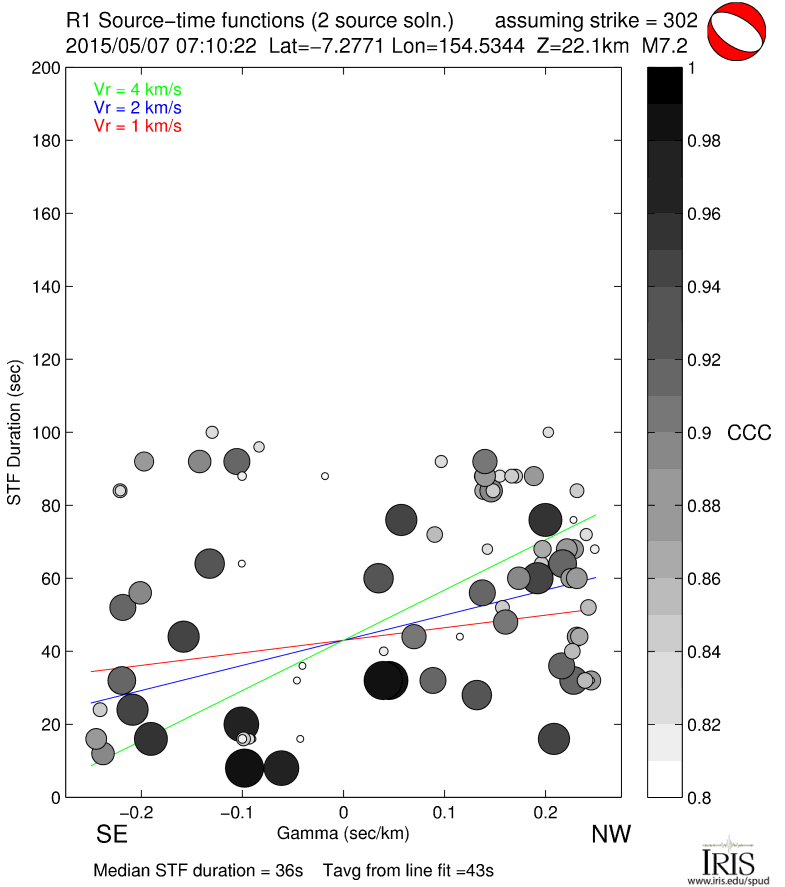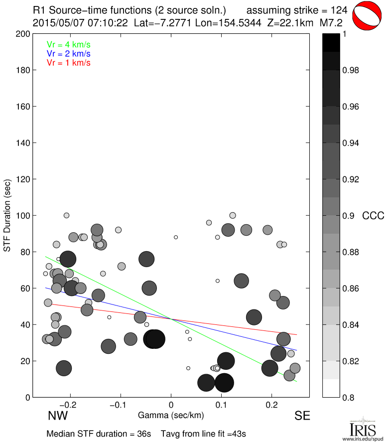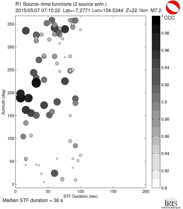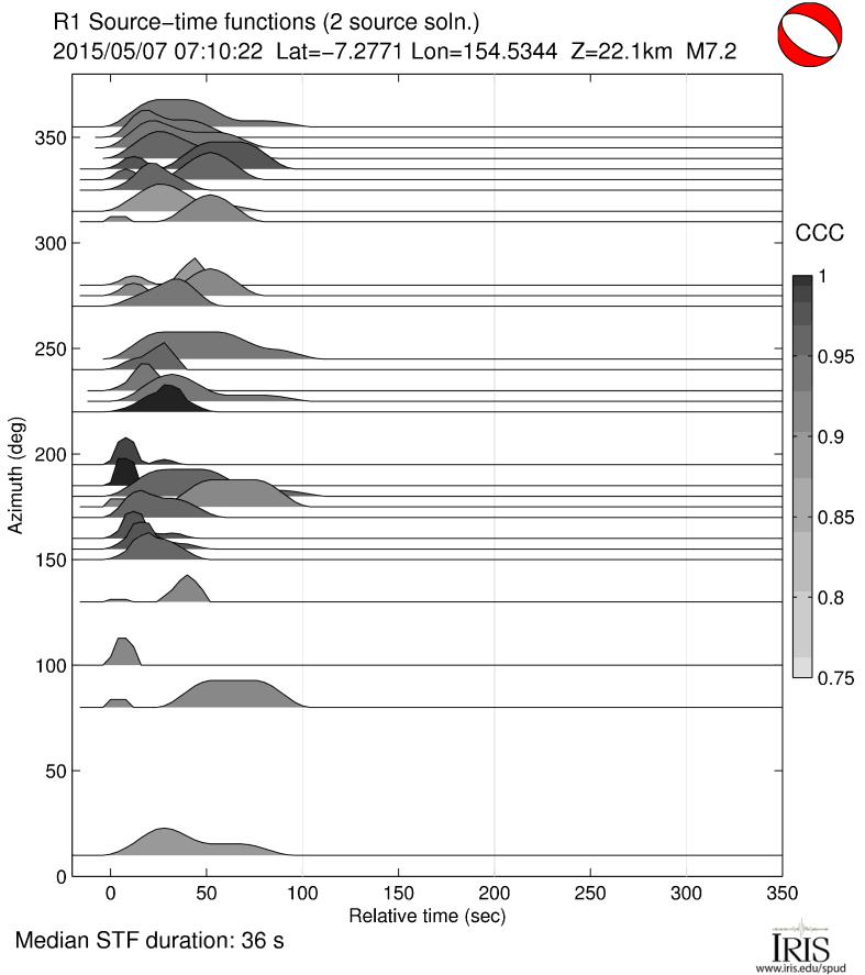 Point-source synthetic seismograms (theoretical Green's functions) are used along with vertical component (LHZ channel) recordings of short-arc Rayleigh waves (R1) from M7.0+ earthquakes to calculate source time functions at GSN and other stations. STFs are estimated using a simple two-source forward modeling approach by sweeping through the parameter space of two smoothed triangle and/or trapezoid functions of various widths, offset and amplitude and retaining the best fitting solution.