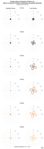 The Surface-Wave Radiation Pattern product shows the patterns of seismic energy radiation by azimuth around the epicenter for Rayleigh and Love waves. The spectral amplitudes for Green’s functions obtained for elementary moment tensors observed at virtual stations are obtained from Mineos, an open-source software that computes synthetic seismograms in a spherically symmetric non-rotating Earth by summing normal modes. By convolving the spectral amplitudes with the components of the moment tensor as given by the Global CMT Project, the radiation pattern for different source mechanisms is obtained.