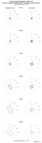 The Surface-Wave Radiation Pattern product shows the patterns of seismic energy radiation by azimuth around the epicenter for Rayleigh and Love waves. The spectral amplitudes for Green’s functions obtained for elementary moment tensors observed at virtual stations are obtained from Mineos, an open-source software that computes synthetic seismograms in a spherically symmetric non-rotating Earth by summing normal modes. By convolving the spectral amplitudes with the components of the moment tensor as given by the Global CMT Project, the radiation pattern for different source mechanisms is obtained.