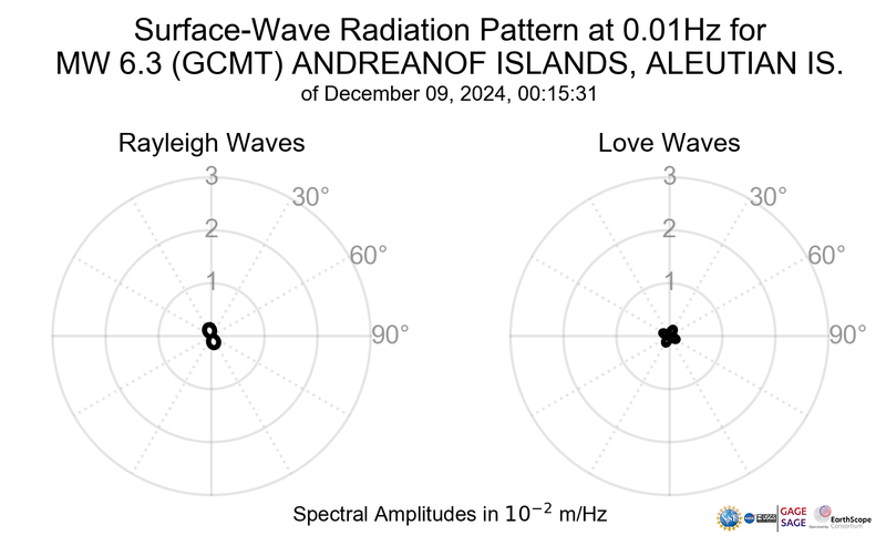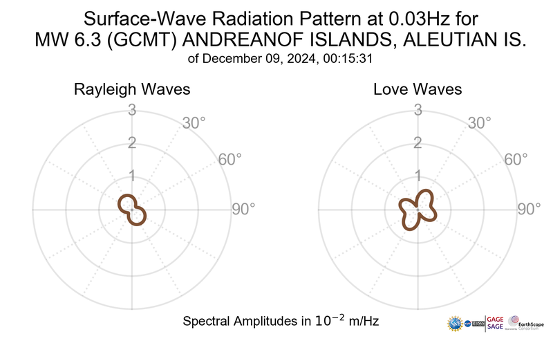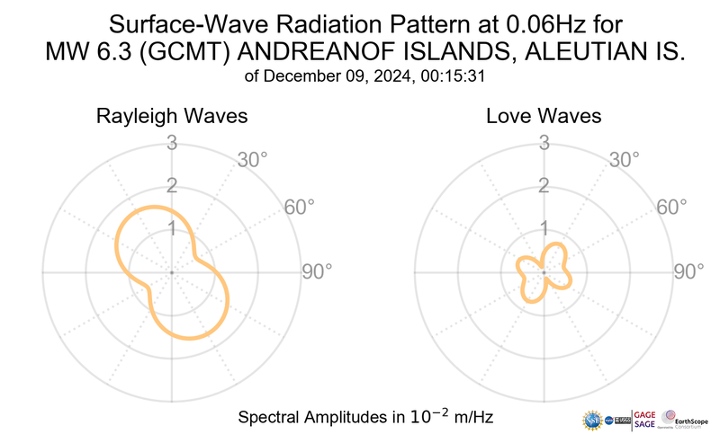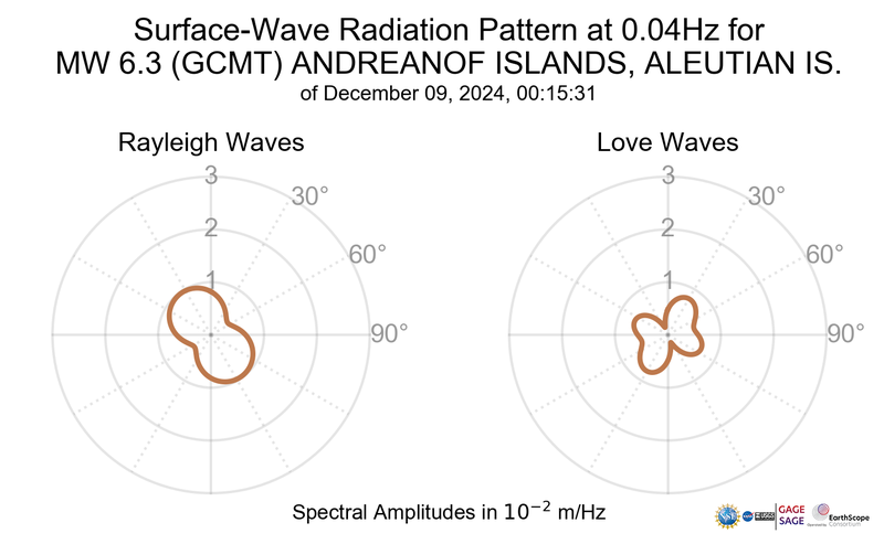 The Surface-Wave Radiation Pattern product shows the patterns of seismic energy radiation by azimuth around the epicenter for Rayleigh and Love waves. The spectral amplitudes for Green’s functions obtained for elementary moment tensors observed at virtual stations are obtained from Mineos, an open-source software that computes synthetic seismograms in a spherically symmetric non-rotating Earth by summing normal modes. By convolving the spectral amplitudes with the components of the moment tensor as given by the Global CMT Project, the radiation pattern for different source mechanisms is obtained.