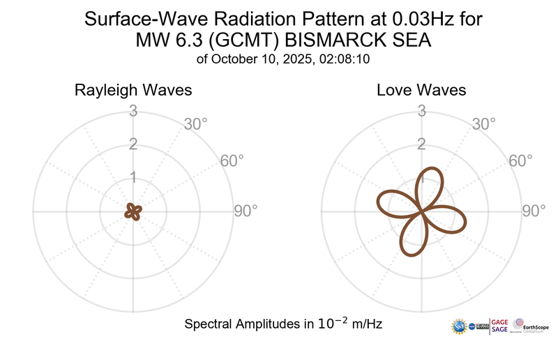 The Surface-Wave Radiation Pattern product shows the patterns of seismic energy radiation by azimuth around the epicenter for Rayleigh and Love waves. The spectral amplitudes for Green’s functions obtained for elementary moment tensors observed at virtual stations are obtained from Mineos, an open-source software that computes synthetic seismograms in a spherically symmetric non-rotating Earth by summing normal modes. By convolving the spectral amplitudes with the components of the moment tensor as given by the Global CMT Project, the radiation pattern for different source mechanisms is obtained.